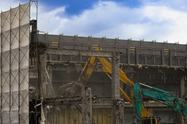 建物を防音パネルで養生し、内装解体を行い、躯体を重機で解体します。